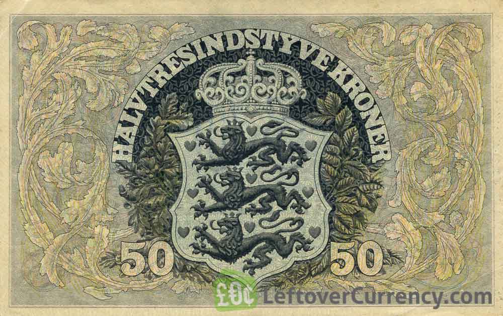 - Text: 50, Danmark, Danmarks Nationalbank, Halvtresindstyve Kroner