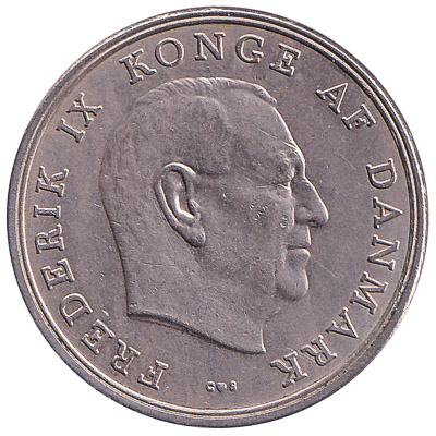 The Royal Danish Mint issued Danish Krone coins in 5 different denominations, including this 5 Danish Kroner coin Frederik IX. They are part of the withdrawn Danish Kroner coins series. The Royal Danish Mint started issuing these 5 Danish Krone coins in 1960. They were withdrawn from circulation in 1972.