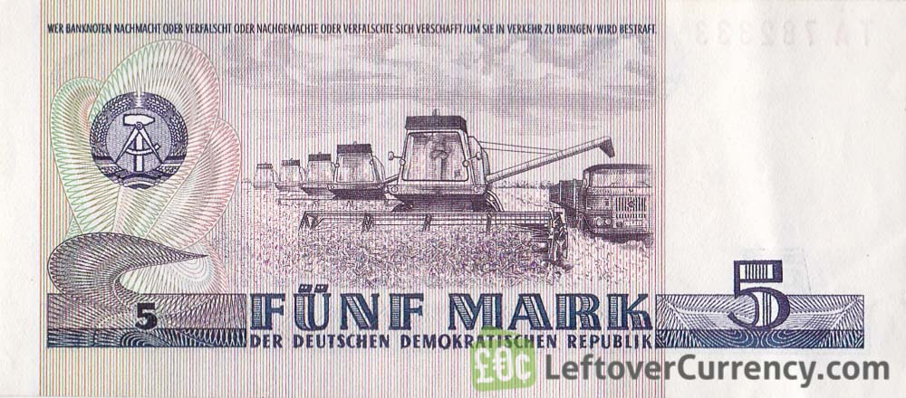 The 5 DDR mark banknote shows German theologian and preacher Thomas Müntzer. On the back of the purple-colored Fünf Mark note is an image of combined harvesters at work.