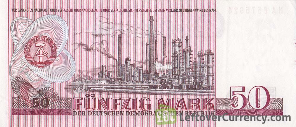 The banknote of 50 DDR mark features a portrait of German philosopher Friedrich Engels on the front side. The back side of the blue-colored Fünfzig Mark note shows an oil refinery.