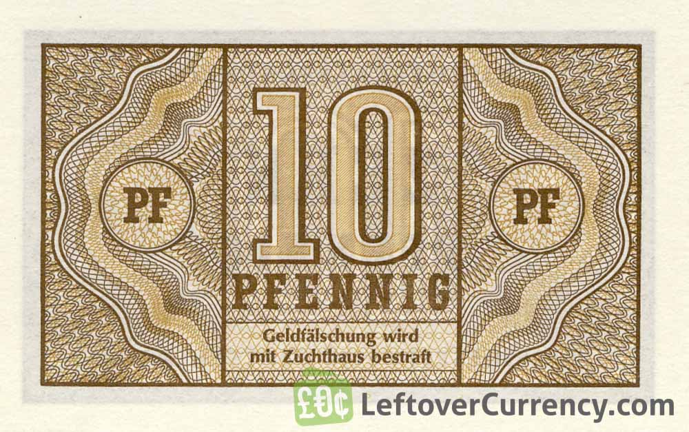 The Deutsche Bundesbank issued Deutsche Mark banknotes in 15 different denominations, including this 10 Pfennig banknote Germany (Bundeskassenschein). They are part of the Deutsche Mark banknotes series. The Deutsche Bundesbank started issuing these 0.1 Deutsche Mark banknotes in 1947. They were withdrawn from circulation in 1949.
