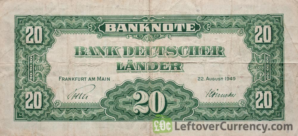 The Deutsche Bundesbank issued Deutsche Mark banknotes in 15 different denominations, including this 20 Deutsche Marks banknote (Bank Deutcher Länder 1949). They are part of the Deutsche Mark banknotes series. The Deutsche Bundesbank started issuing these 20 Deutsche Mark banknotes in 1949. They were withdrawn from circulation in 1960.