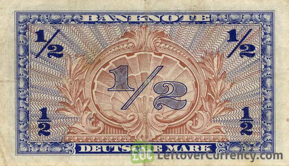 The Deutsche Bundesbank issued Deutsche Mark banknotes in 15 different denominations, including this 50 Pfennig banknote Germany (Bank Deutcher Länder 1948). They are part of the Deutsche Mark banknotes series. The Deutsche Bundesbank started issuing these 0.5 Deutsche Mark banknotes in 1948. They were withdrawn from circulation in 1953.