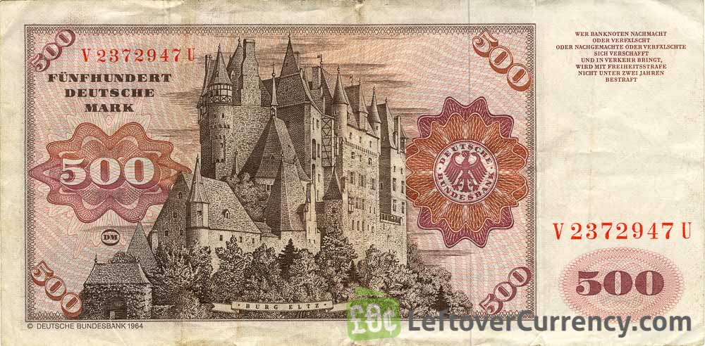 Repeat these steps for any other notes and coins you want to exchange. Complete checkout and get paid within 5 days of receiving your currencies. To exchange your 500 Deutsche Marks banknote (Eltz Castle) for cash: add it to your wallet now!