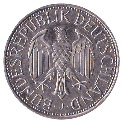 The Deutsche Bundesbank issued Deutsche Mark coins in 8 different denominations, including this 1 Deutsche Mark coin. They are part of the Deutsche Mark coins series. The Deutsche Bundesbank started issuing these 1 Deutsche Mark coins in 1950. They were withdrawn from circulation in 2002.