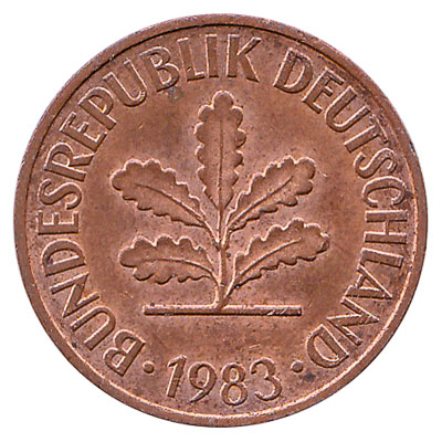 The Deutsche piece of 2 pfennig is imprinted with the words ‘Bundesrepublik Deutschland’, meaning Federal Republic of Germany. The reverse of this coin shows an oak seedling, which is a metaphor for growth in the German postwar era. There are 100 pfennigs in a Deutsche Mark, so 2 pfennigs is the equivalent of 0.02 DM.