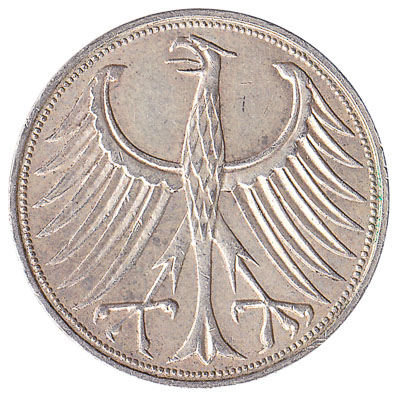 The German coin of 5 deutsche mark has the German federal eagle on the back. On the 5 Mark coin the inscription reads ‘Bundesrepublik Deutschland’.