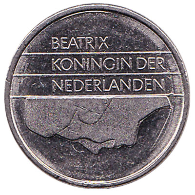 The coin of 10 cents was the equivalent of 0.10 Dutch Guilders. The modernist coin’s design features five vertical parallel lines and a rectangle on the reverse side. The obverse side shows the portrait of Beatrix, Queen of the Netherlands.