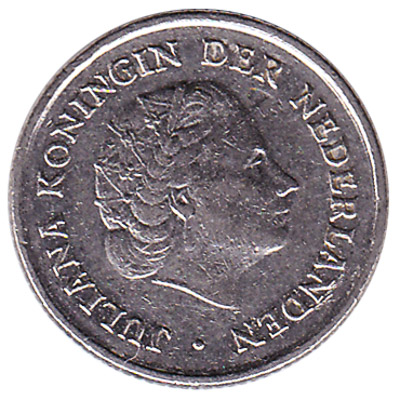 The Dutch 10 cent coin was locally known as a ‘dubbeltje’. The 0.10 NLG piece features the portrait of Queen Juliana of the Netherlands and the Dutch royal Crown. The nickel 10 cent coin has a weight of 1.5 gr and a diameter of 15mm.