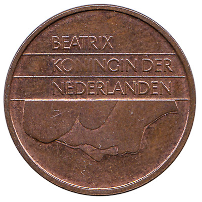 This 5 cent Gulden coin features a portrait of Beatrix of the Netherlands on the obverse, and its face value on the reverse.