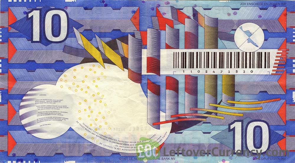 The Nederlandsche Bank issued Dutch Guilder banknotes in 11 different denominations, including this 10 Dutch Guilders banknote (Ijsvogel 1997). They are part of the Dutch Guilder banknotes series. The Nederlandsche Bank started issuing these 10 Dutch Guilder banknotes in 1997. They were withdrawn from circulation in 2002.