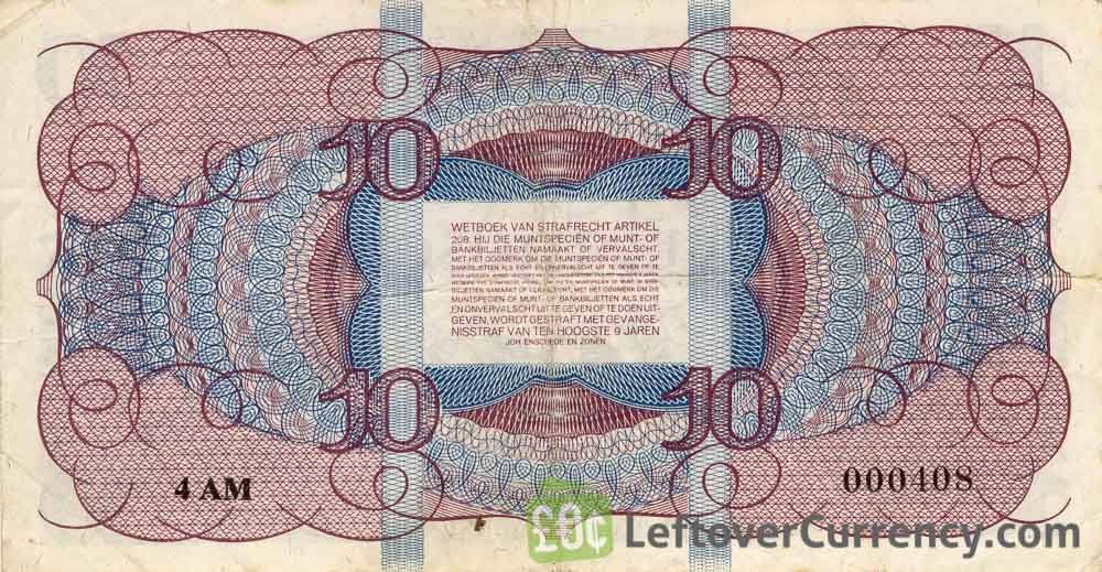 The Nederlandsche Bank issued Dutch Guilder banknotes in 11 different denominations, including this 10 Dutch Guilders banknote (Lieftincktientje). They are part of the Dutch Guilder banknotes series. The Nederlandsche Bank started issuing these 10 Dutch Guilder banknotes in 1945. They were withdrawn from circulation in 1949.