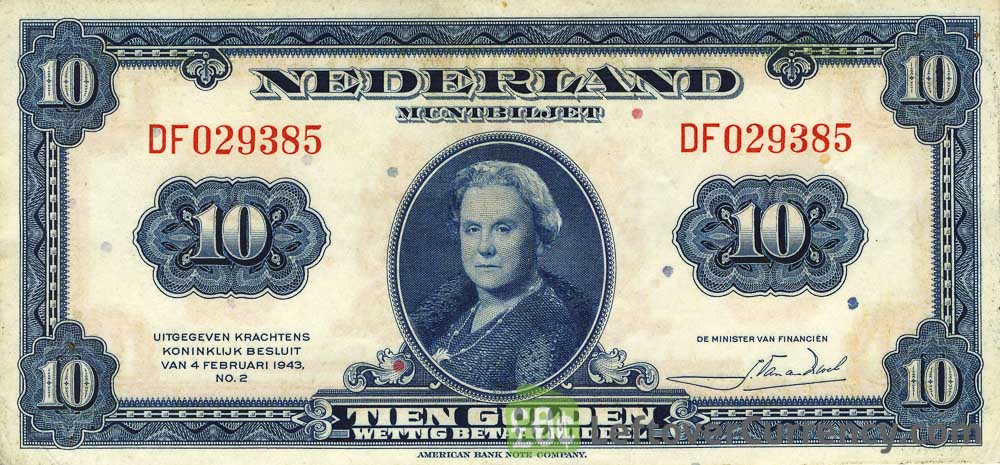 The Nederlandsche Bank issued Dutch Guilder banknotes in 11 different denominations, including this 10 Dutch Guilders banknote (Muntbiljet 1943). They are part of the Dutch Guilder banknotes series. The Nederlandsche Bank started issuing these 10 Dutch Guilder banknotes in 1943. They were withdrawn from circulation in 1945.