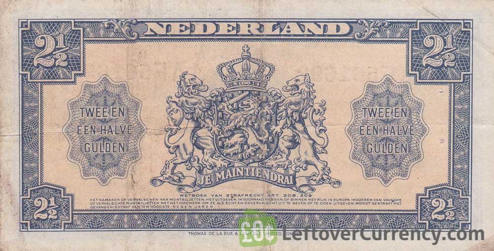 The blue and pink coloured banknote of 2 1/2 Gulden was in use during the last months of WWII in occupied Holland. On the 2.5 Gulden bill is a portrait of the Dutch Queen Wilhelmina.