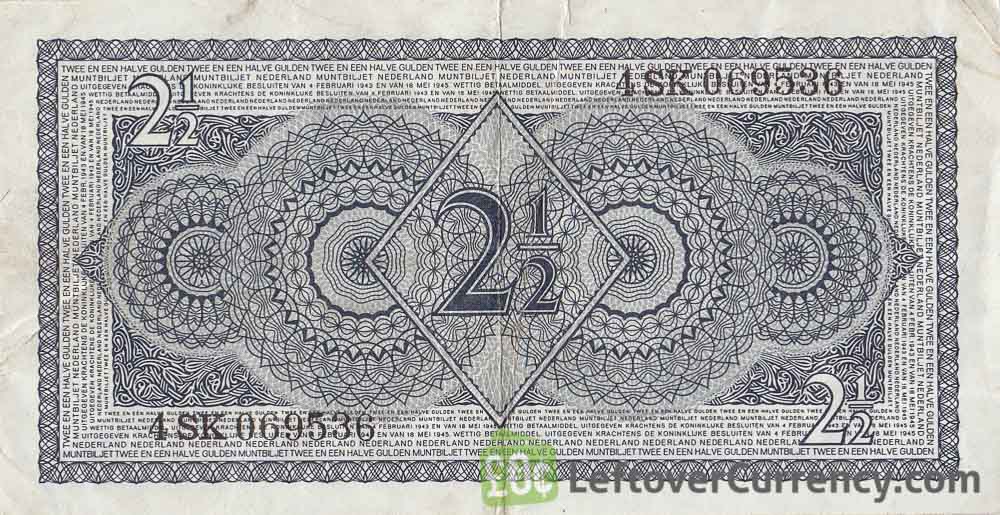 The banknote of 2 and a half guilder is blue-gray and portrays Dutch queen Juliana. On the 2 1/2 NLG bill a caption reads ‘Muntbiljet’ and ‘Twee en een halve gulden’.