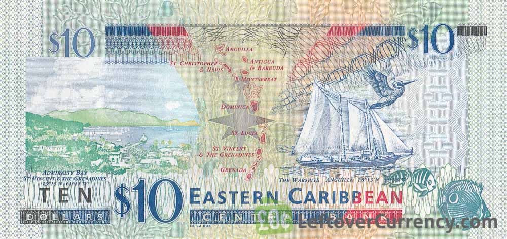 - Text: 10, Admiralty Bay St Vincent & The Grenadines, Anguilla, St. Christopher & Nevis, Antigua & Barbuda, Montserrat, Dominica, St. Lucia, St. Vincent & The Grenadines, Grenada, Eastern Caribbean Central Bank, ECCB, Ten Dollars, The Warspite Anguilla, These notes are legal tender for the payment of any amount