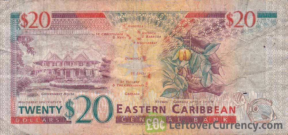 - Text: 20, Eastern Caribbean Central Bank, Montserrat Government House, Nutmeg Grenada, St. Christopher & Nevis, Anguilla, Antigue & Barbuda, Montserrat, Dominica, St. Lucia, St. Vincent & The Grenadines, Grenada, These notes are legal tender for the payment of any amount, Twenty Dollars