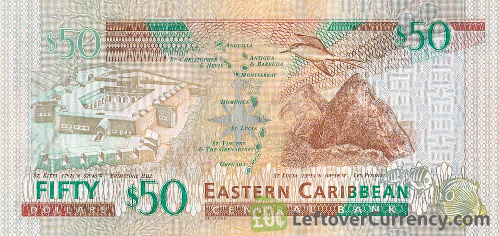 - Text: 50, Eastern Caribbean Central Bank, ECCB, Fifty Dollars, St. Christopher & Nevis, Anguilla, Antigue & Barbuda, Montserrat, Dominica, St. Lucia, St. Vincent & The Grenadines, Grenada, St. Kitts Brimstone Hill, St. Lucia Les Pitons, These notes are legal tender for the payment of any amount
