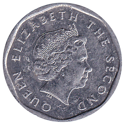 The lowest value coin in the Eastern Caribbean States used to be the one cent coin, until its withdrawal from circulation in 2015. It is made of aluminium and weighs only 1.03 gram. The front tof the 1c coin features two crossed branches with leaves. On the back side of the $0.01 XCD coin is the portrait of the head of the Commonwealth, Queen Elizabeth the Second.