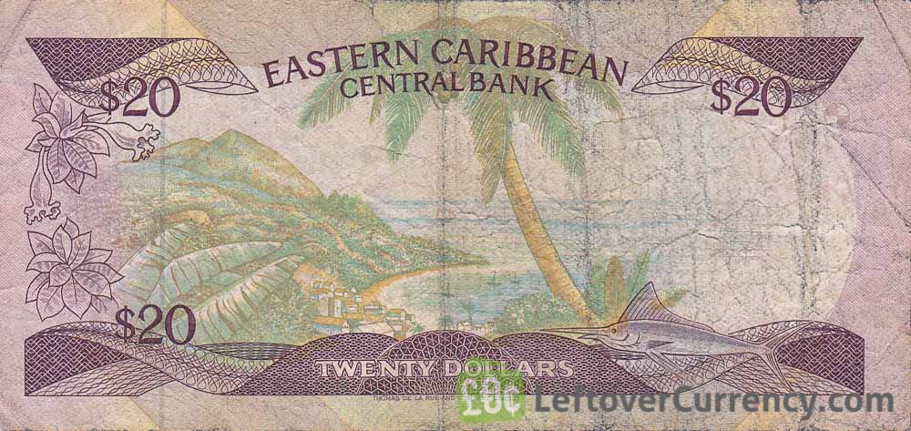 - Text: 20, East Caribbean Central Bank, St Christopher and Nevis, Antigua and Barbuda, Montserrat, Dominica, St. Lucia, St. Vincent and the Grenadines, Grenada, These notes are legal tender for the payment of any amount, Twenty Dollars