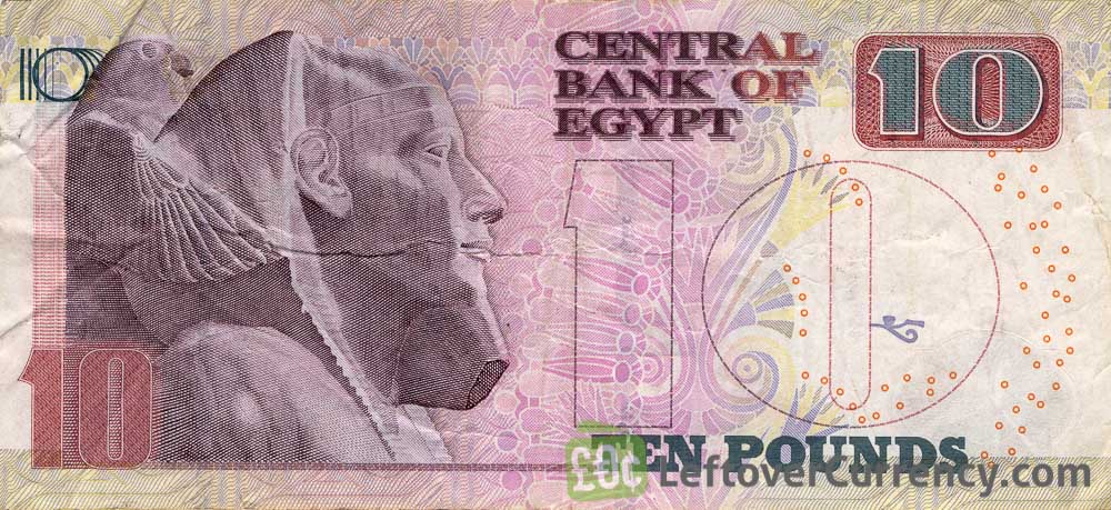 The Central Bank of Egypt issued Egyptian Pound banknotes in 8 different denominations, including this 10 Egyptian Pounds banknote (Farao statue). They are part of the current Egyptian Pound banknotes series. The Central Bank of Egypt started issuing these 10 Egyptian Pound banknotes in 2001. They are currently still in circulation.