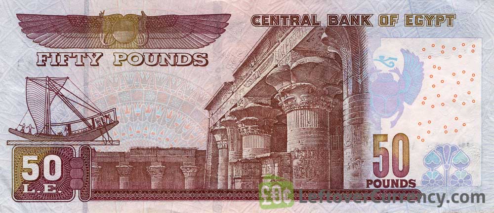 The Egyptian banknote of fifty pounds features the Abu Hariba Mosque and Edfu temple. Printed on the £50 note is the text ‘central bank of Egypt’.