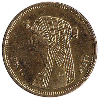 The coin of 50 Piastres has the value of half an Egyptian pound. On the 50 piastres piece is the portrait of Cleopatra, ruler of Egypt, with a falcon on her head. The brass-plated steel coin weighs 6 1/2 grams and has a diameter of 23mm.