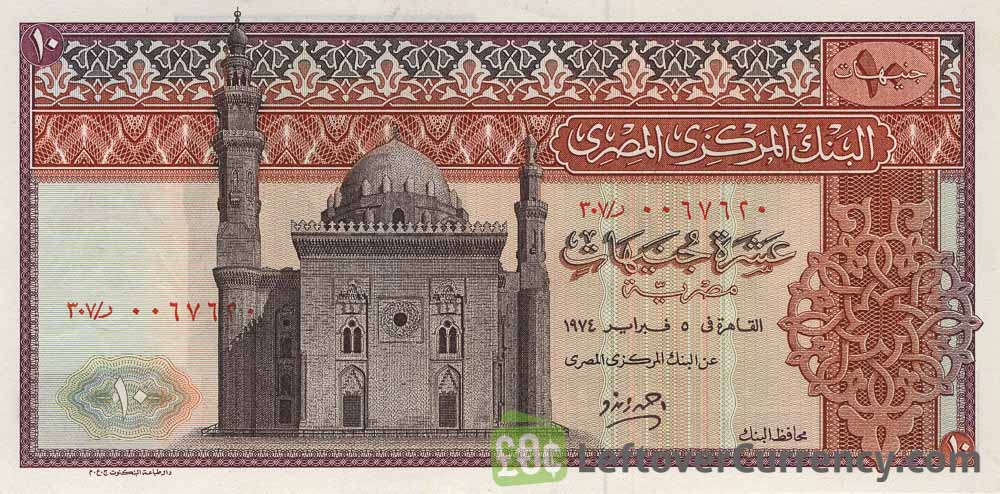 This Egyptian ten pounds bill has an image of the Sultan Hassan Mosque in Cairo, Egypt. On the £10 banknote a caption reads ‘central bank of Egypt’.
