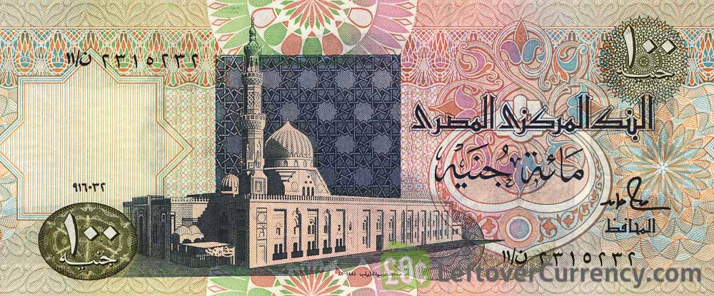 The banknote of one hundred pounds has an image of Al-Sayida Zainab Mosque in Cairo, Egypt. Printed on the £100 banknote is the text ‘central bank of Egypt’.