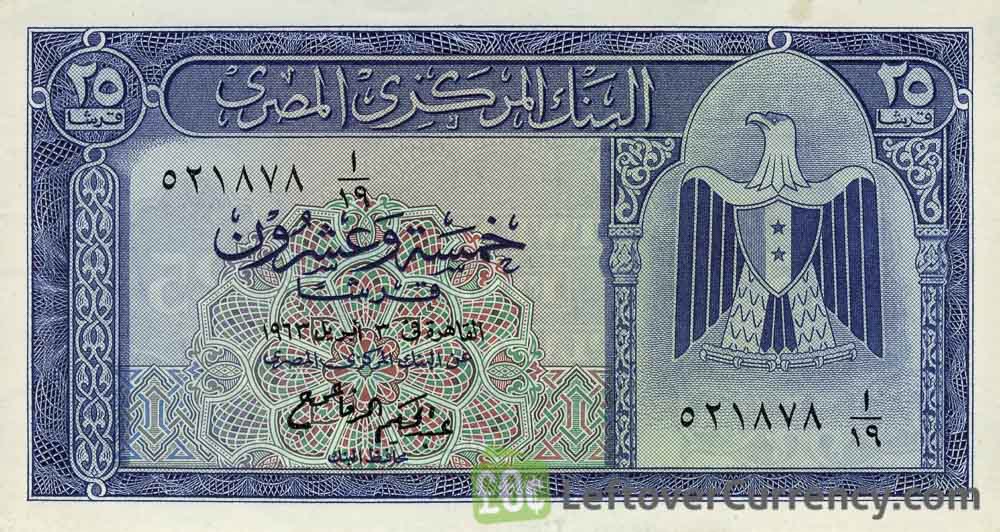 Repeat these steps for any other notes and coins you want to exchange. Complete checkout and get paid within 5 days of receiving your currencies. To exchange your 25 Piastres banknote Egypt (1961-1966 issue) for cash: add it to your wallet now!