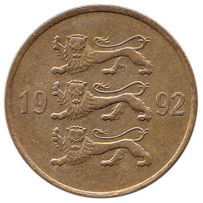 The Eesti Pank issued Estonian Kroon coins in 7 different denominations, including this 20 Senti coin Estonia (gold colored). They are part of the Estonian Krooni coins series. The Eesti Pank started issuing these 0.2 Estonian Kroon coins in 1997. They were withdrawn from circulation in 2010.