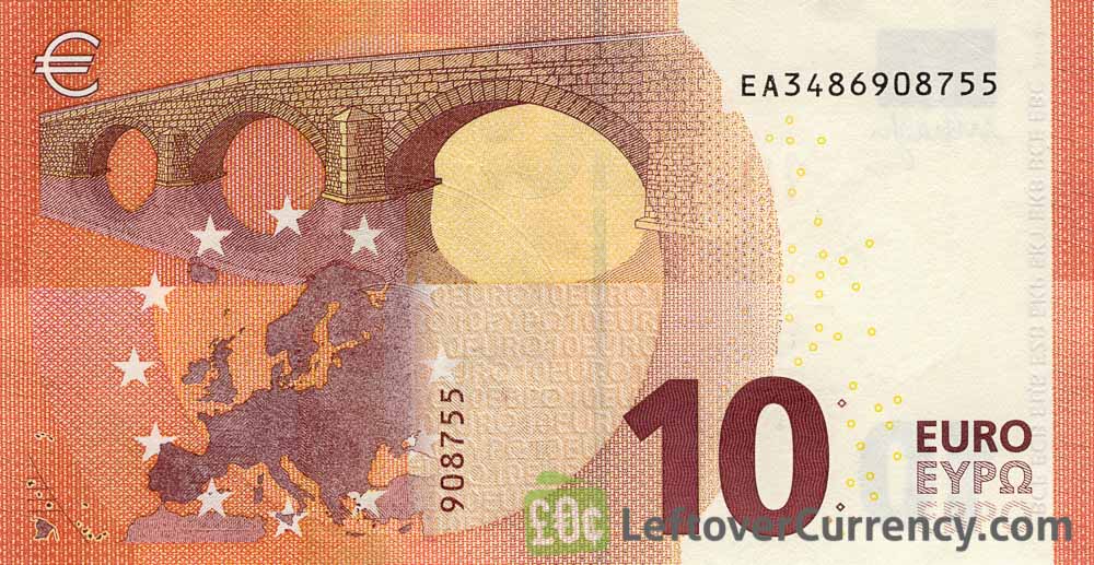 The 10 euro banknote from the second series has improved security features, including a hologram strip. The map of Europe is larger than the previous version so it includes Cyprus. The red-colored €10 banknote has a bridge and arch in Romanesque architectural style.