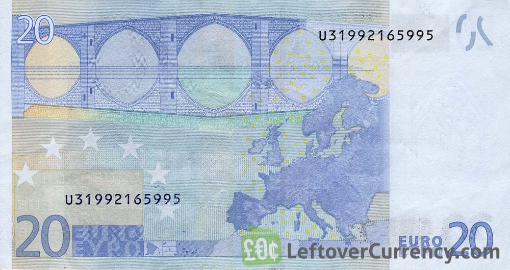 The European Central Bank issued Euro banknotes in 7 different denominations, including this 20 Euros banknote (First series). They are part of the Euro banknotes series. The European Central Bank started issuing these 20 Euro banknotes in 2002. They are currently still in circulation.