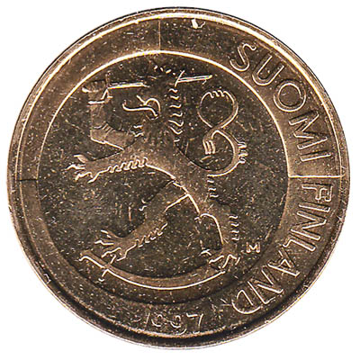 Finland’s 1 markka coin at the time of the Euro changeover shows traditional ornaments surrounding the denomination on the obverse. The back side of the 1 mk piece shows the Finnish coat of arms, featuring a crowned lion with an armoured human arm brandishing a sword, trampling on a sabre with its hindpaws.