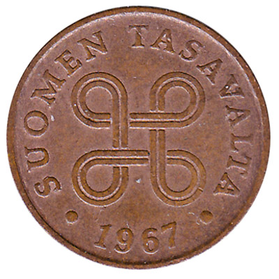 The Bank of Finland issued Finnish Markka coins in 8 different denominations, including this 1 penni coin Finland (copper). They are part of the Finnish Markka coins series. The Bank of Finland started issuing these 0.01 Finnish Markka coins in 1963. They were withdrawn from circulation in 1969.