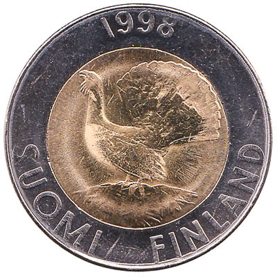 The bimetallic 10 Finnish markkaa coin shows branches and berries from the rowan tree on the obverse side. The bird on the reverse side of the 10 mk piece is a wood grouse, also known as western capercaillie. The 10 FIM coin was the highest pre-euro valued coin in Finland before the introduction of the Euro in 2002.