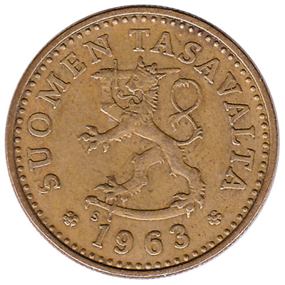The Bank of Finland issued Finnish Markka coins in 8 different denominations, including this 10 pennia coin Finland (aluminium bronze). They are part of the Finnish Markka coins series. The Bank of Finland started issuing these 0.1 Finnish Markka coins in 1963. They were withdrawn from circulation in 1982.
