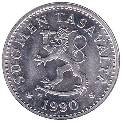 The Bank of Finland issued Finnish Markka coins in 8 different denominations, including this 10 pennia coin Finland (aluminium). They are part of the Finnish Markka coins series. The Bank of Finland started issuing these 0.1 Finnish Markka coins in 1983. They were withdrawn from circulation in 1990.