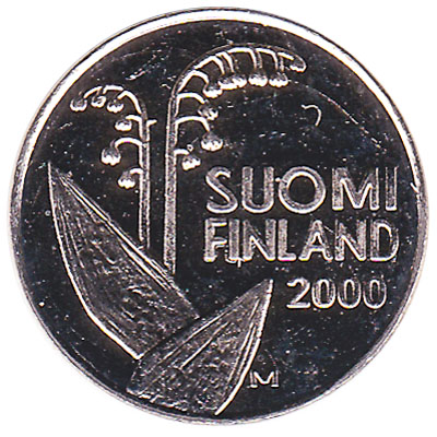 This 10 pennia coin was the lowest value coin in circulation at the time of the Euro changeover in Finland in 2002. On the obverse side of the 0.10 FIM 10 Finnish pennia coin is a stylised honeycomb. The flower on the reverse side is a lily of the valley, native throughout the cool temperate Northern Hemisphere in Europe.
