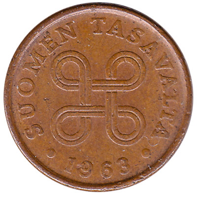 The Bank of Finland issued Finnish Markka coins in 8 different denominations, including this 5 pennia coin Finland (copper). They are part of the Finnish Markka coins series. The Bank of Finland started issuing these 0.05 Finnish Markka coins in 1963. They were withdrawn from circulation in 1977.