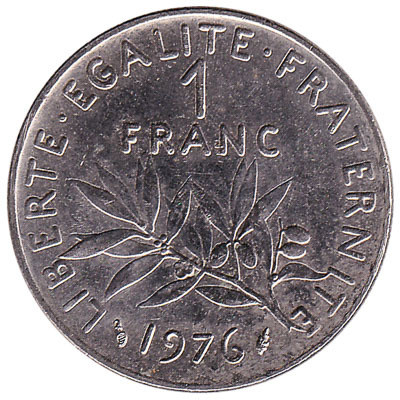The 1 French franc coin shows the national symbol of France, the goddess of liberty Marianne, sowing seeds on a field. It is a design by French artist Oscar Roty. Text on the 1 FRF coin includes the national motto ‘Liberté Égalité Fraternité’ and ‘Republique Française’. Design elements include olive branches.