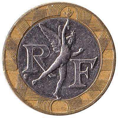 The Banque de France issued French Franc coins in 10 different denominations, including this France 10 Franc coin. They are part of the French Franc coins series. The Banque de France started issuing these 10 French Franc coins in 1988. They were withdrawn from circulation in 2002.