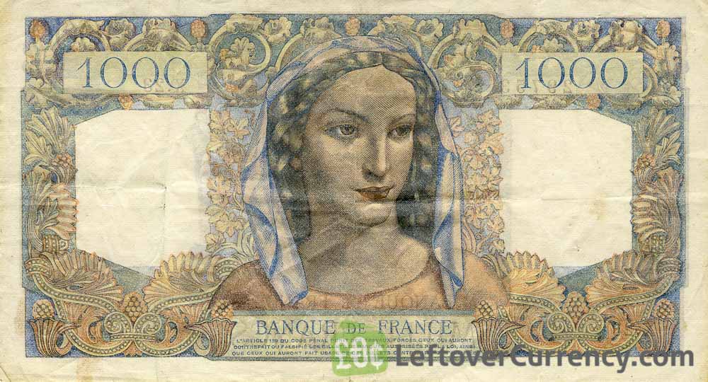The French note of 1000 mille francs features mythical figures Minerva and Hercules. On the 1000 French francs banknote a caption reads ‘Banque de France’.