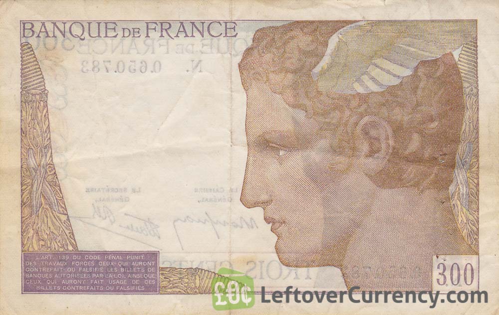 The Banque de France issued French Franc banknotes in 13 different denominations, including this 300 French Francs banknote (Clement Serveau 1938). They are part of the French Franc banknotes pre-1958 series. The Banque de France started issuing these 300 French Franc banknotes in 1938. They were withdrawn from circulation in 1950.