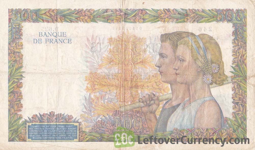 The Banque de France issued French Franc banknotes in 13 different denominations, including this 500 French Francs banknote (La Paix). They are part of the French Franc banknotes pre-1958 series. The Banque de France started issuing these 500 French Franc banknotes in 1940. They were withdrawn from circulation in 1944.