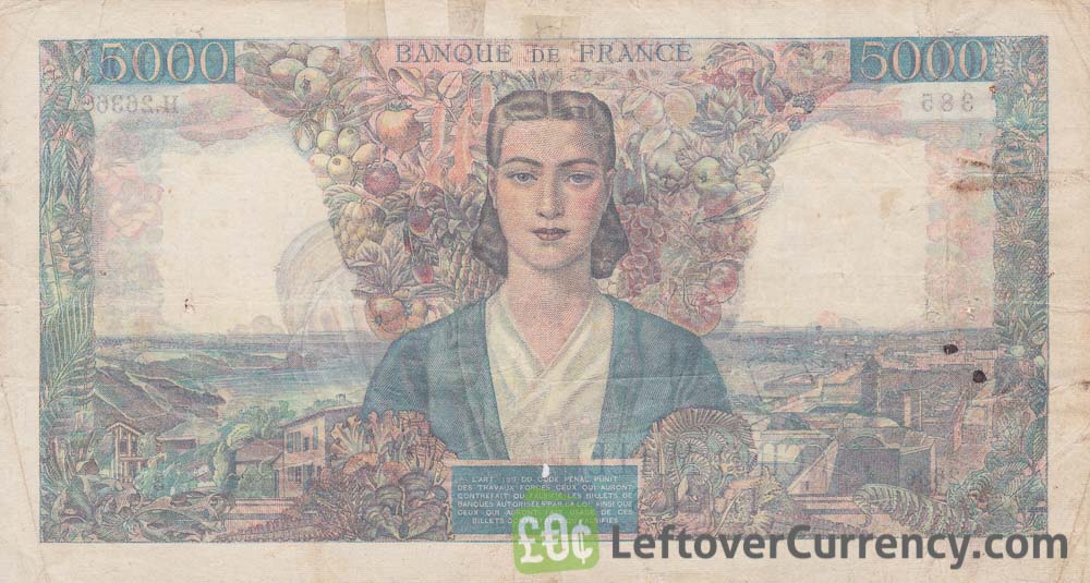 The Banque de France issued French Franc banknotes in 13 different denominations, including this 5000 French Francs banknote (Billet Union Française). They are part of the French Franc banknotes pre-1958 series. The Banque de France started issuing these 5000 French Franc banknotes in 1942. They were withdrawn from circulation in 1948.