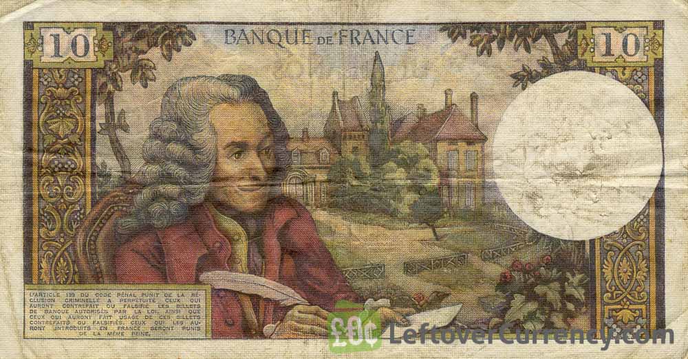 The Banque de France issued French Franc banknotes in 12 different denominations, including this 10 French Francs banknote (Voltaire). They are part of the French Franc banknotes series. The Banque de France started issuing these 10 French Franc banknotes in 1963. They were withdrawn from circulation in 1973.