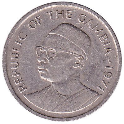 The Central Bank of The Gambia issued Gambian Dalasi coins in 6 different denominations, including this 25 Bututs coin Gambia (oil palm). They are part of the Gambian Dalasi coins series. The Central Bank of The Gambia started issuing these 0.25 Gambian Dalasi coins in 1971. They are currently still in circulation.