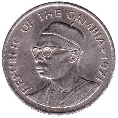 The Central Bank of The Gambia issued Gambian Dalasi coins in 6 different denominations, including this 50 Bututs coin Gambia (ox). They are part of the Gambian Dalasi coins series. The Central Bank of The Gambia started issuing these 0.5 Gambian Dalasi coins in 1971. They are currently still in circulation.