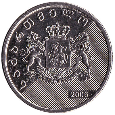 The coin of ₾1 Georgian lari features the coat of arms of the Republic of Georgia. Elements on the 2006-dated coin include two lions, a shield and St George riding a horse. The cupro-nickel 1 GEL piece weighs 8 grams and measures 26.2mm in diameter.